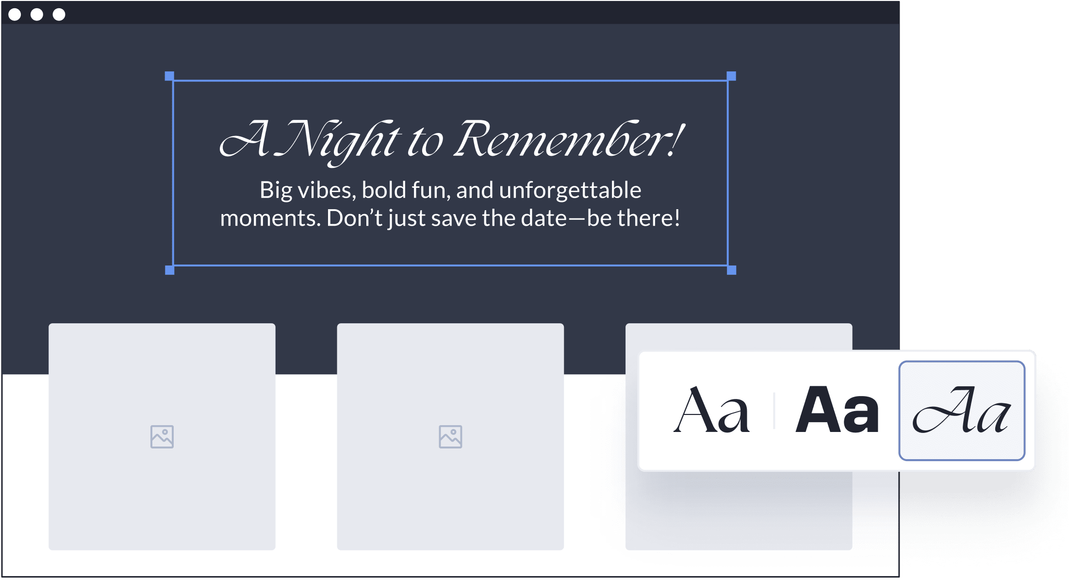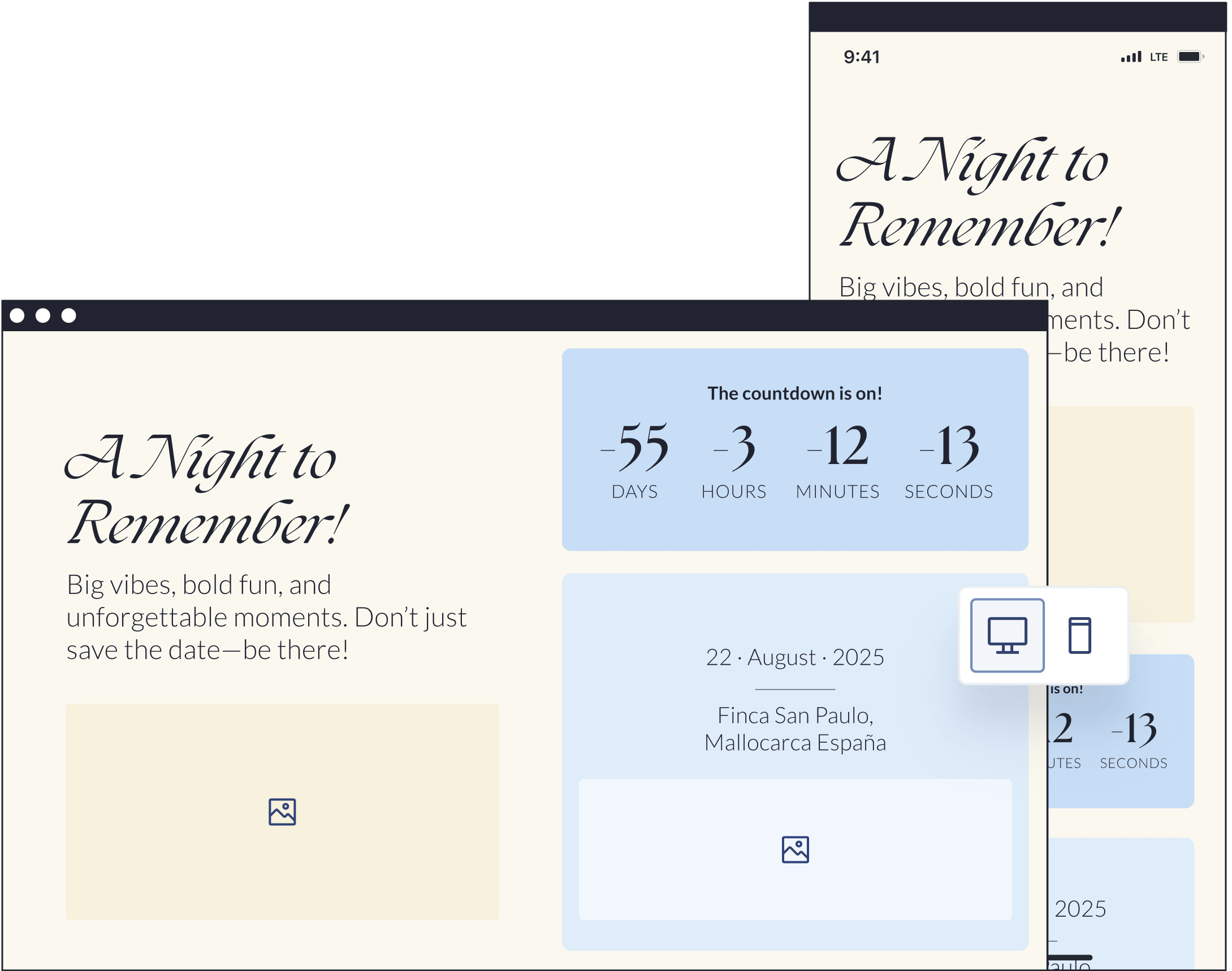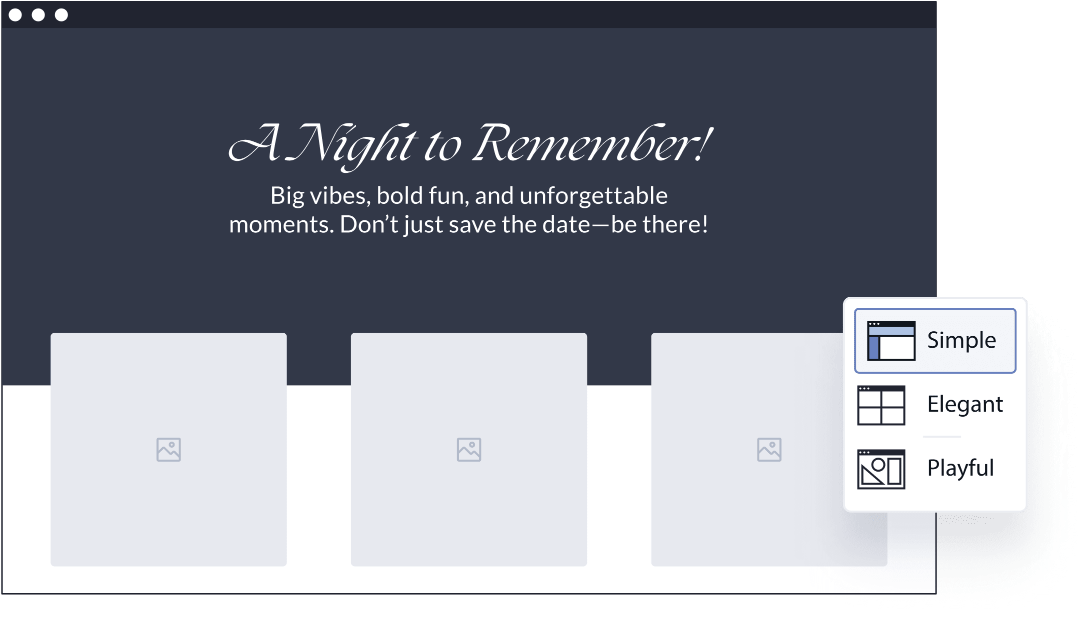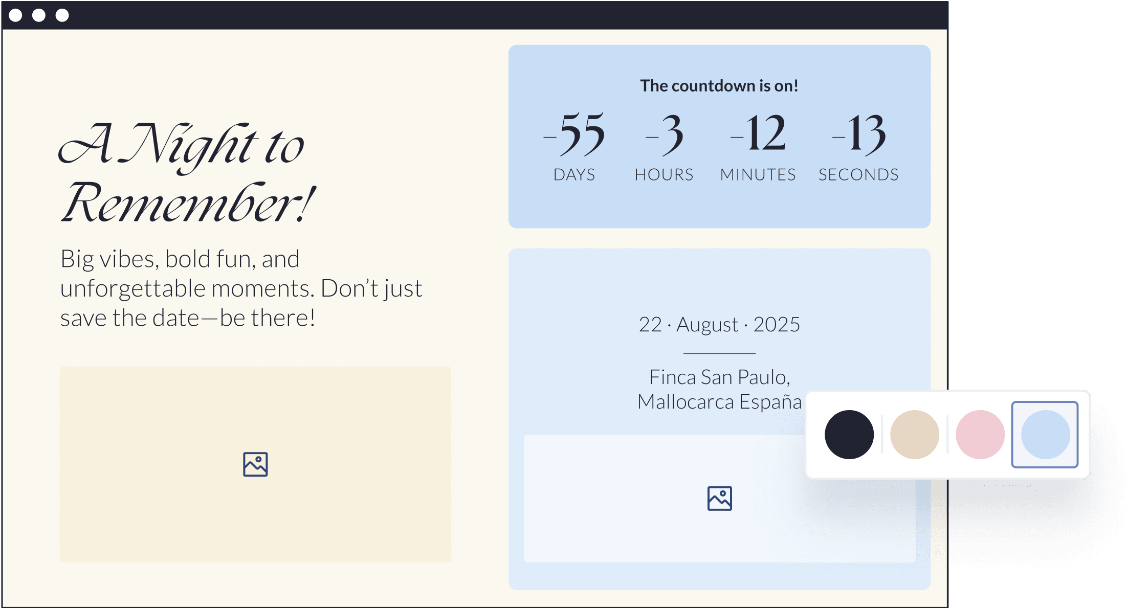 Make your invitation uniquely yours! Choose from different layouts to arrange your text and images just the way you like them, all within the same design.